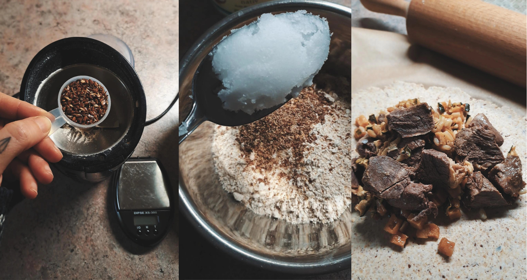 Die Hafer­flo­cken und Lein­sa­men müs­sen gemah­len wer­den, z.B. in einer Kaf­fee­mühle. Dann gibst du das Kokos­fett dazu und kne­test los. Mit dem Was­ser sorgst du für mehr Geschmei­dig­keit und bin­nen 5min hast du einen Teig der nicht mehr klebt. Du brauchst kein Mehl bzw. keine wei­te­ren gemah­le­nen Hafer­flo­cken zum aus­rol­len. Nur deine Hand ver­klebt etwas. Wasche sie vor dem aus­rol­len und du wirst sehen, der Teig bleibt geschmei­dig. Du kannst ihn aus­rol­len und Bele­gen wie einen Blech­ku­chen oder du legst ihn in eine Spring­form und befüllst ihn, du kannst ihn aber auch für eine Pas­tete mit Decke nut­zen.