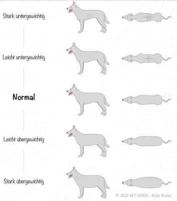 10 % über dem Idealgewicht gelten als beginnendes Übergewicht und 20 % über dem Idealgewicht bedeuten ein deutliches Übergewicht. Aber woher weiß ich was mein Hund wiegen sollte? Als Richtwert kann man nach Rasseprofilen gehen oder nach dem Muttertier, sofern dieses bekannt ist. Aber das Körpergewicht allein ist kein sicherer Indikator. Entscheidend sind Körperform und Tastbefund, beurteilt nach dem Body Condition Score (BCS). Dies ist ein 5- bis 9‑Pun