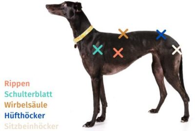Bei langhaarigen oder stark behaarten Rassen hilft nur das Erfühlen der Knochenpunkte und Fettdepots.